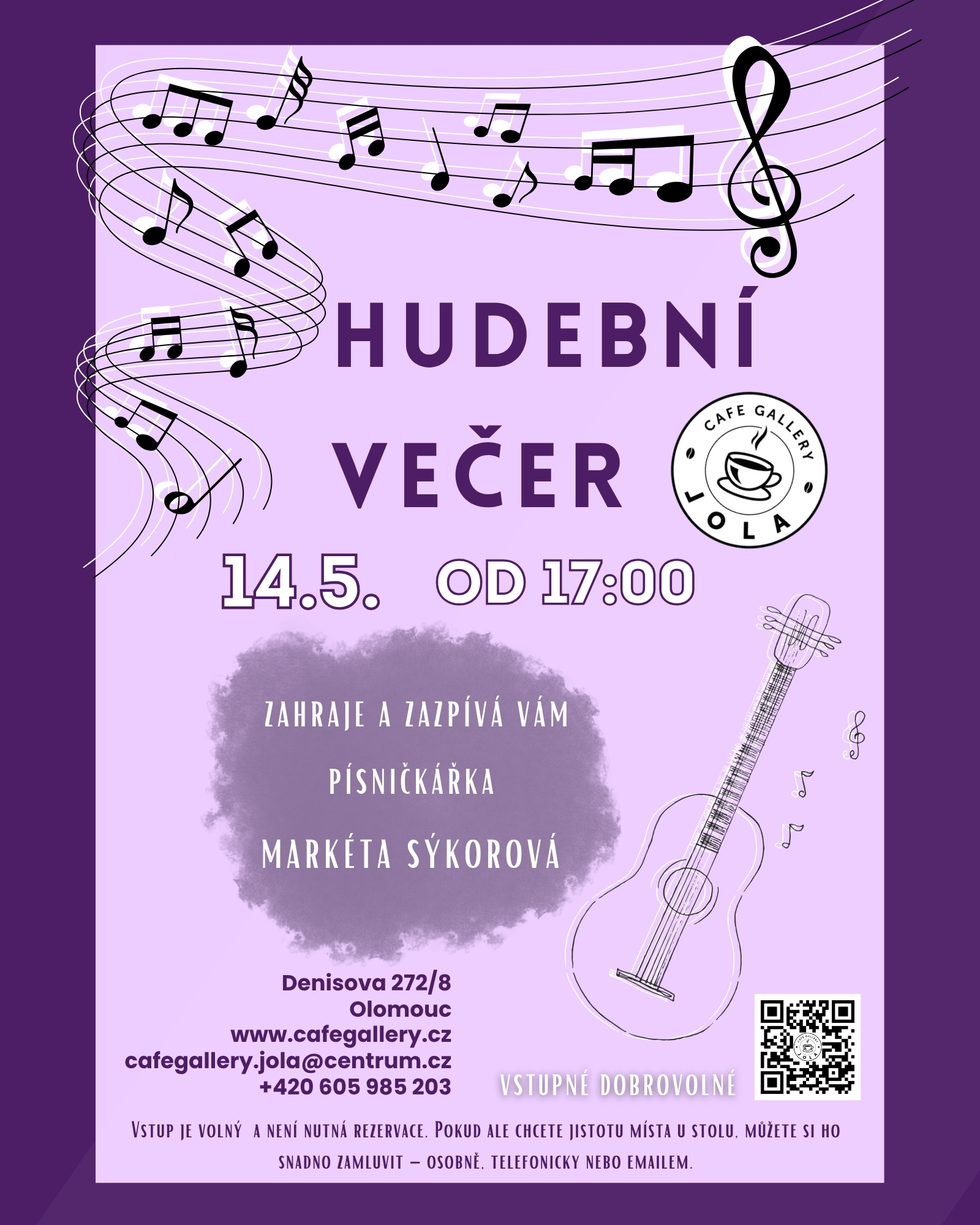 Srdečně vás zveme do kavárny na Hudební večer  dne 14.5. 2026 od 17.00 hod.